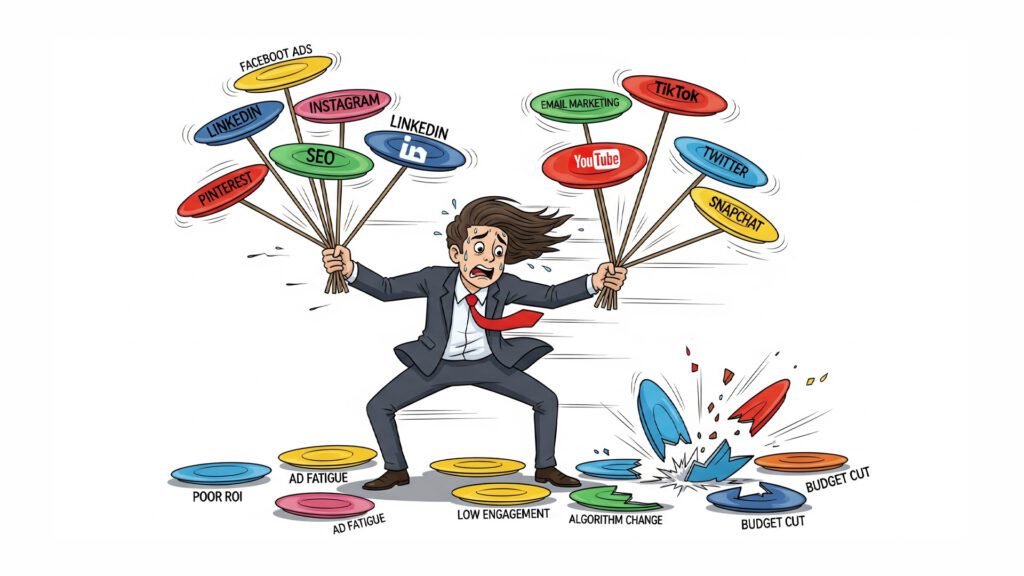 Welcome to the marketing overwhelm epidemic—where business owners have become digital plate-spinners, frantically trying to keep every marketing channel spinning while their actual business slowly suffocates under the weight of their own “comprehensive strategy.”